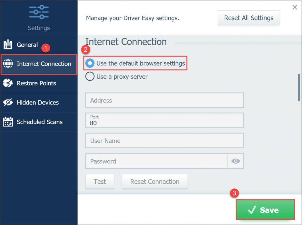 Si vous utilisez les paramètres de proxy dans Driver Easy, veuillez aller dans le panneau Paramètres et le définir sur Utiliser les paramètres du navigateur par défaut. Voici comment procéder :